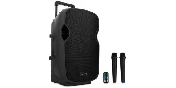 Audibax Denver 12 Caixa de Som Ativa de 12” com Bateria, Rodízios + 2 Microfones Sem Fio de Mão